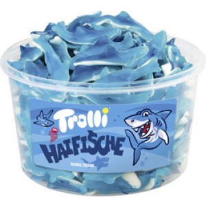 Trolli Haaien Fruitsnoepjes, Blauwe Gummies met Schuimsuiker Bodem, Ronde Doos 1,2kg